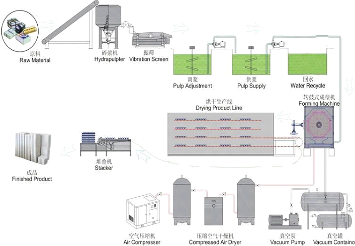 2-成型系統:轉鼓式成型機,模具,空壓機,空壓機罐,真空泵,真空罐,高壓水泵,汽水分離泵等。